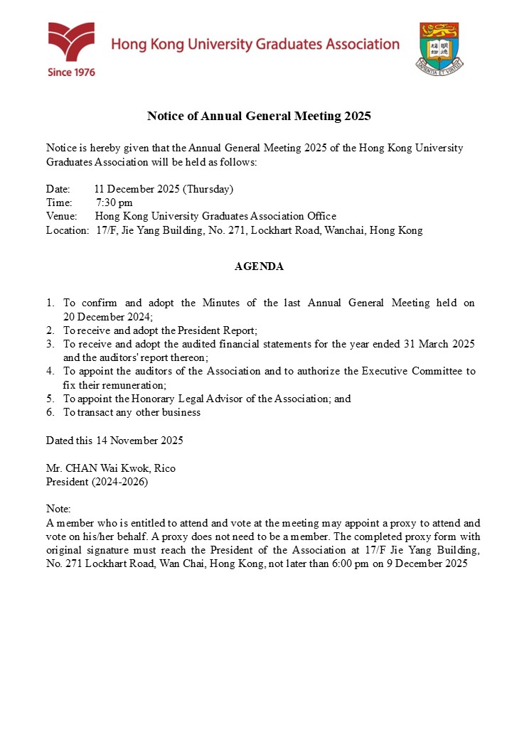 Notice is hereby given that the Annual General Meeting 2025 of the Hong Kong University Graduates Association will be held as follows: