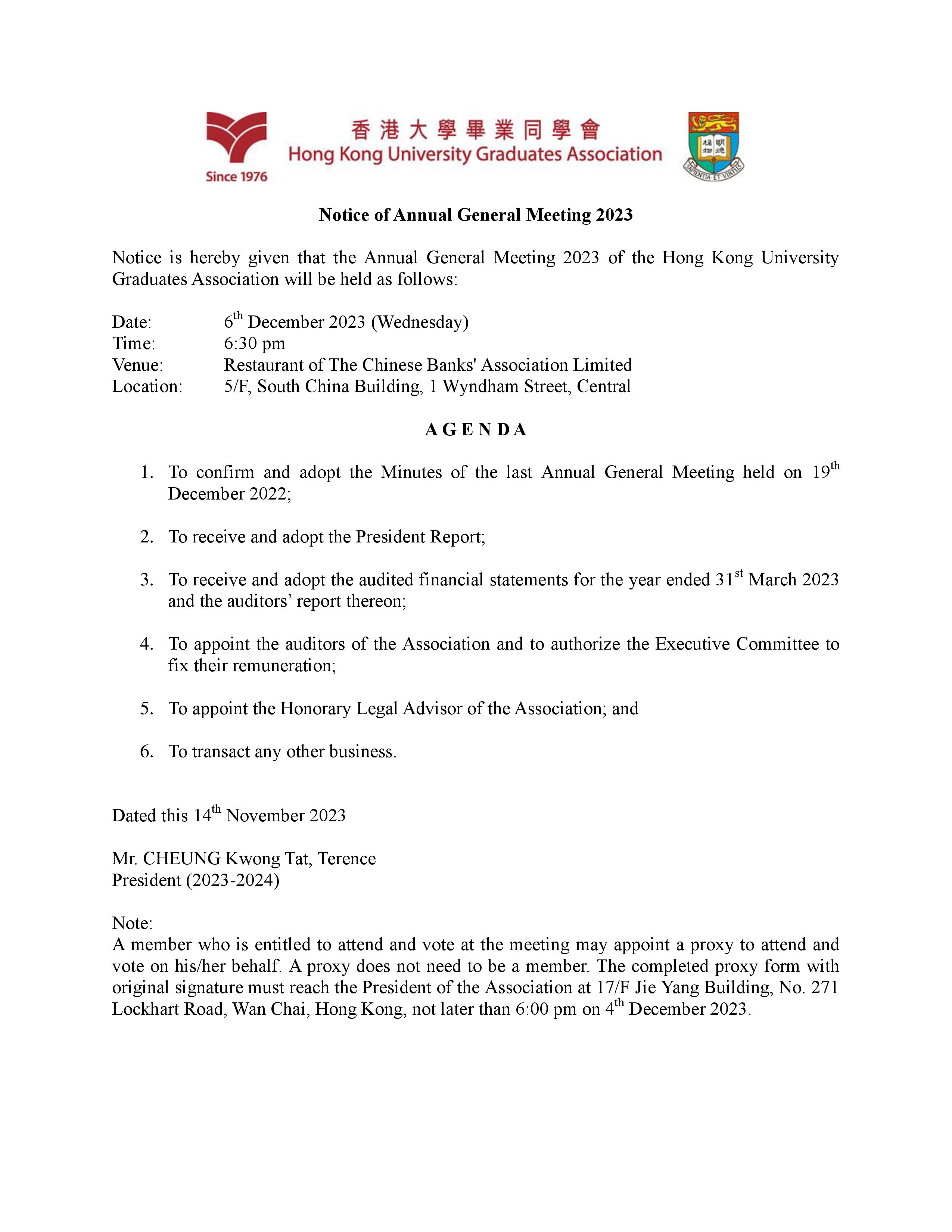 Notice is hereby given that the Annual General Meeting 2023 of the Hong Kong University Graduates Association will be held as follows: