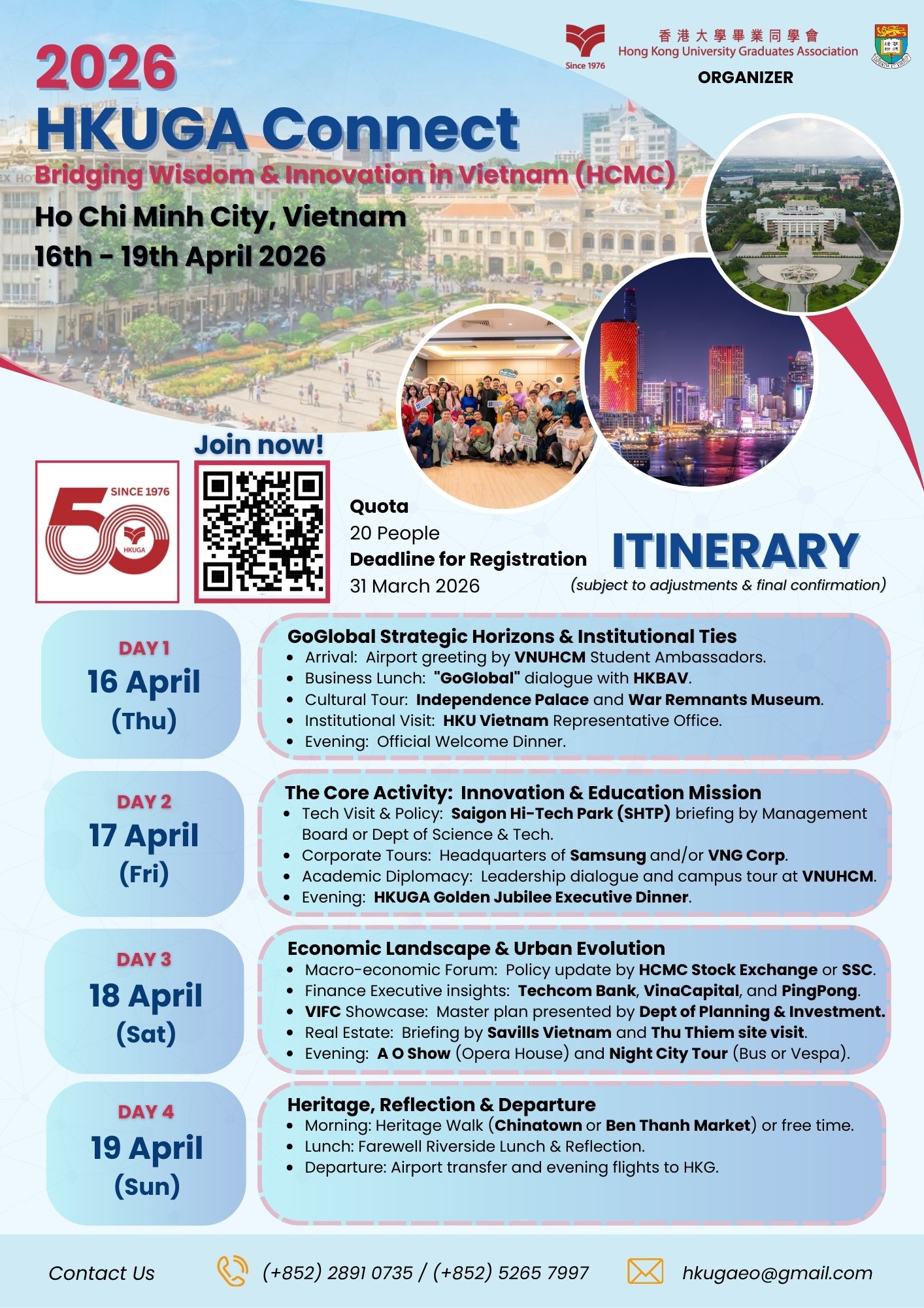 As we commemorate the 50th Anniversary of the Hong Kong University Graduates Association, we are thrilled to officially invite you to our milestone overseas mission: 2026 HKUGA Connect: Bridging Wisdom & Innovation in Vietnam (HCMC).