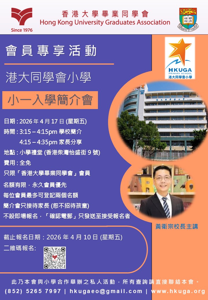 香港大學畢業同學會將於2026年4月17日 (星期五) 舉辦「港大同學會小學:小一入學簡介會」,
